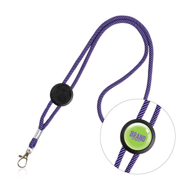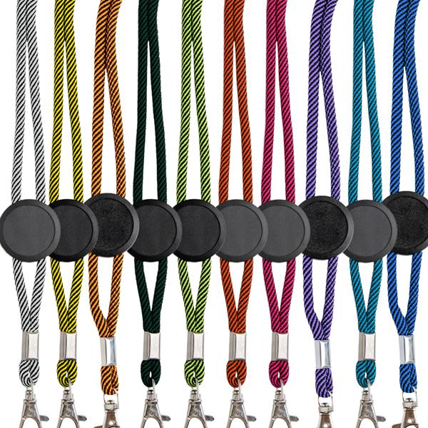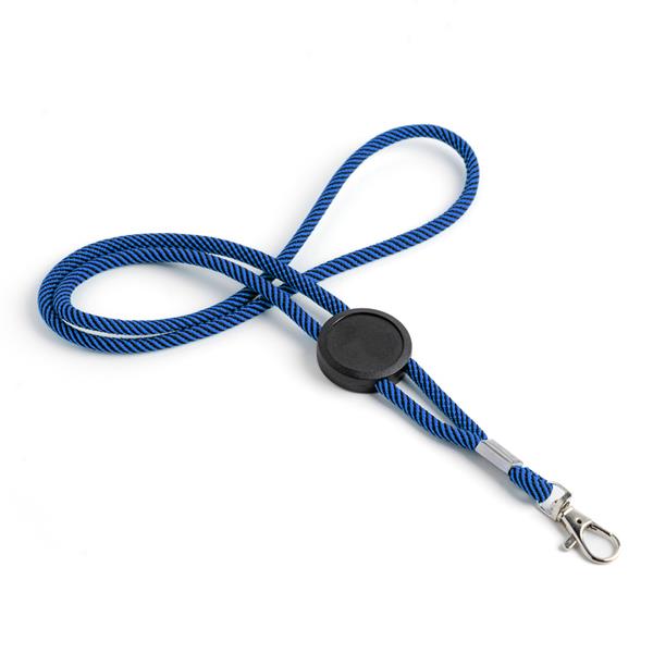 Lanyard tubular em poliéster, ajustável e mosquetão.